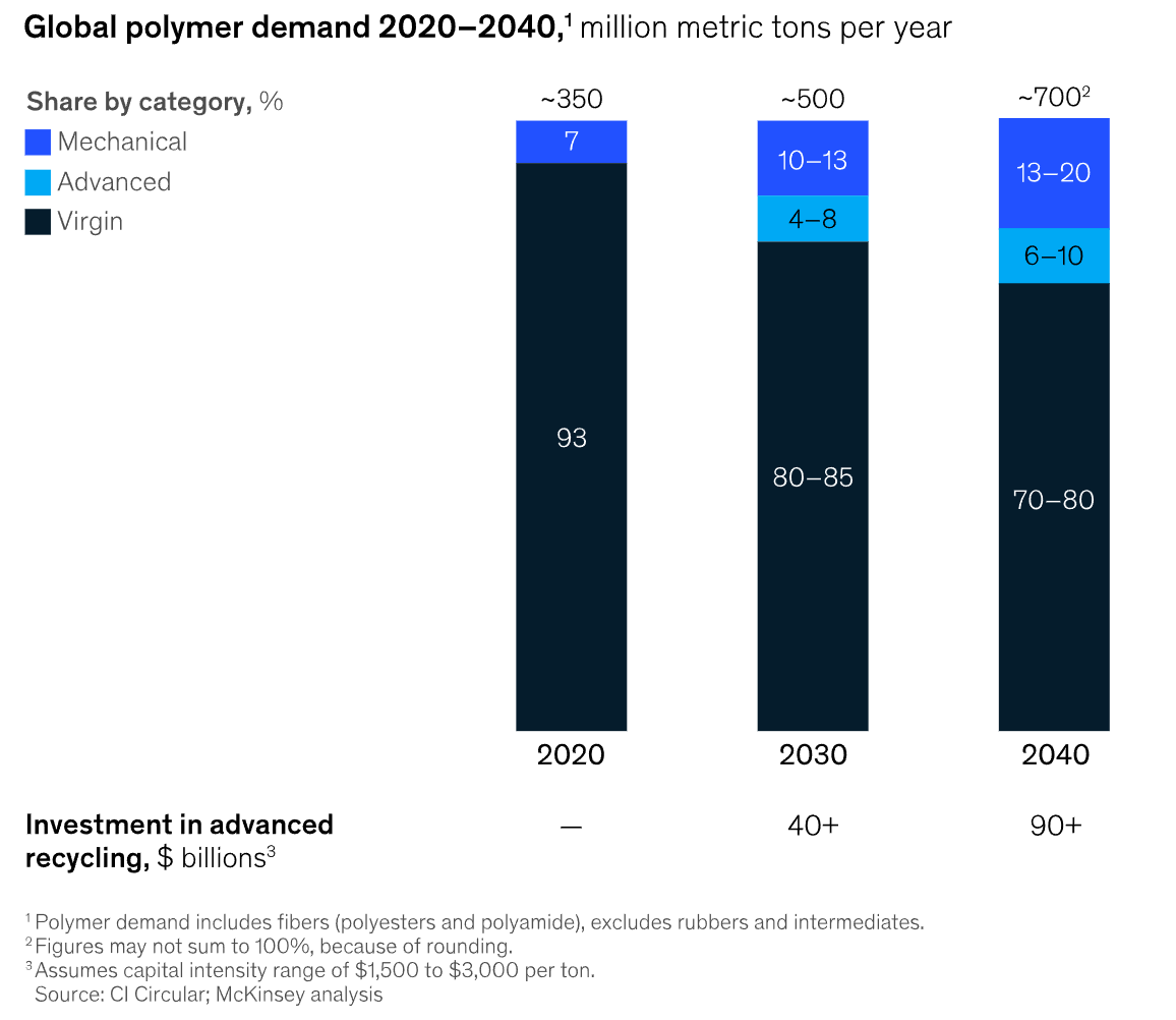 The importance of recycling in managing plastic waste will remain crucial, with mechanical recycling serving as the prevailing method. However, advanced recycling techniques, such as chemical recycling, will gain traction and have the potential to account for 4-8% of the overall plastics supply by 2030.